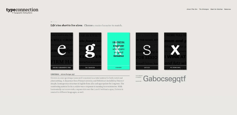 In this game, you first select the main type of letter. Next, select a font that you want to combine with the previously selected main letter. After completing the steps, Type Connection will explain your choice, including whether or not the combination matches well, based on typographic design principles.
